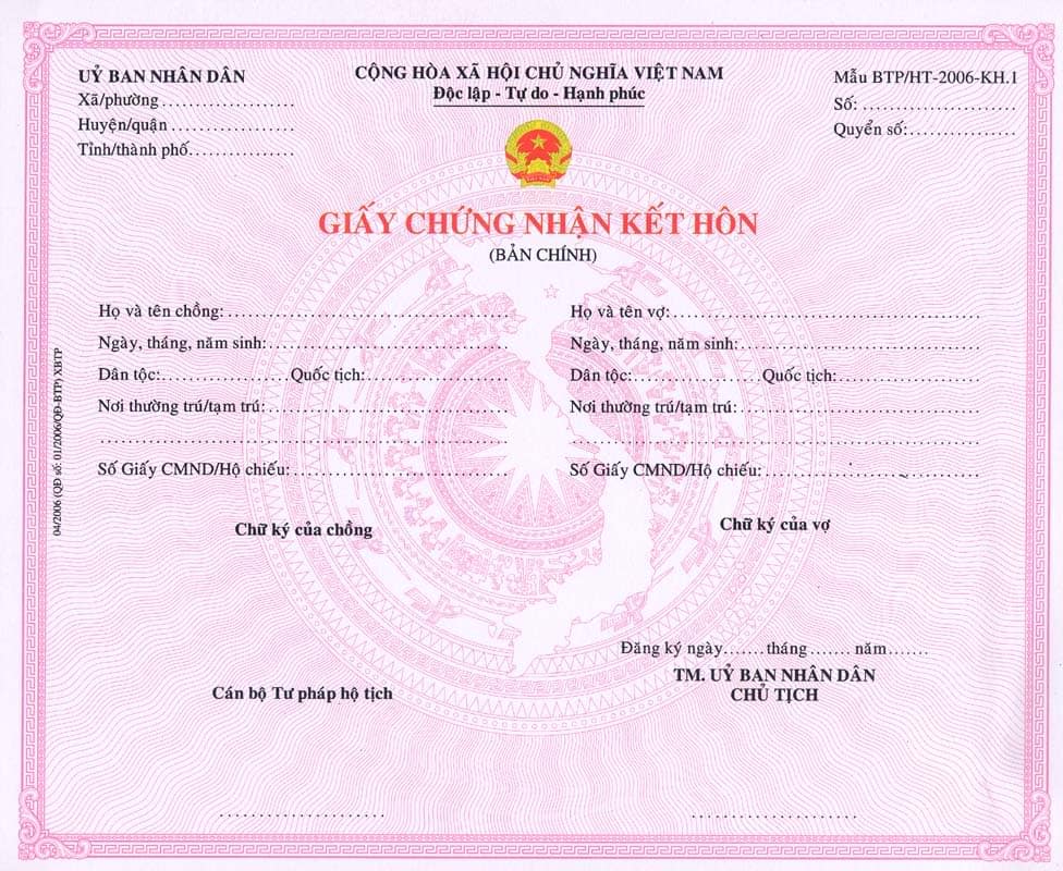 Các loại chữ ký được ghi trên giấy đăng ký kết hôn, và do cơ quan hay tổ chức của nước ngoài có đủ thẩm quyền để cấp bạn. Khi đó quý khách sẽ phải nhờ đến Cục lãnh sự Bộ Ngoại Giao Việt Nam xác nhận thì lúc đó hợp pháp hóa lãnh sự giấy đăng ký kết hôn của bạn mới có hiệu lực.